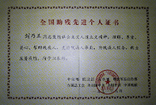 “全國(guó)助殘先進(jìn)個(gè)人”榮譽(yù)稱號(hào)